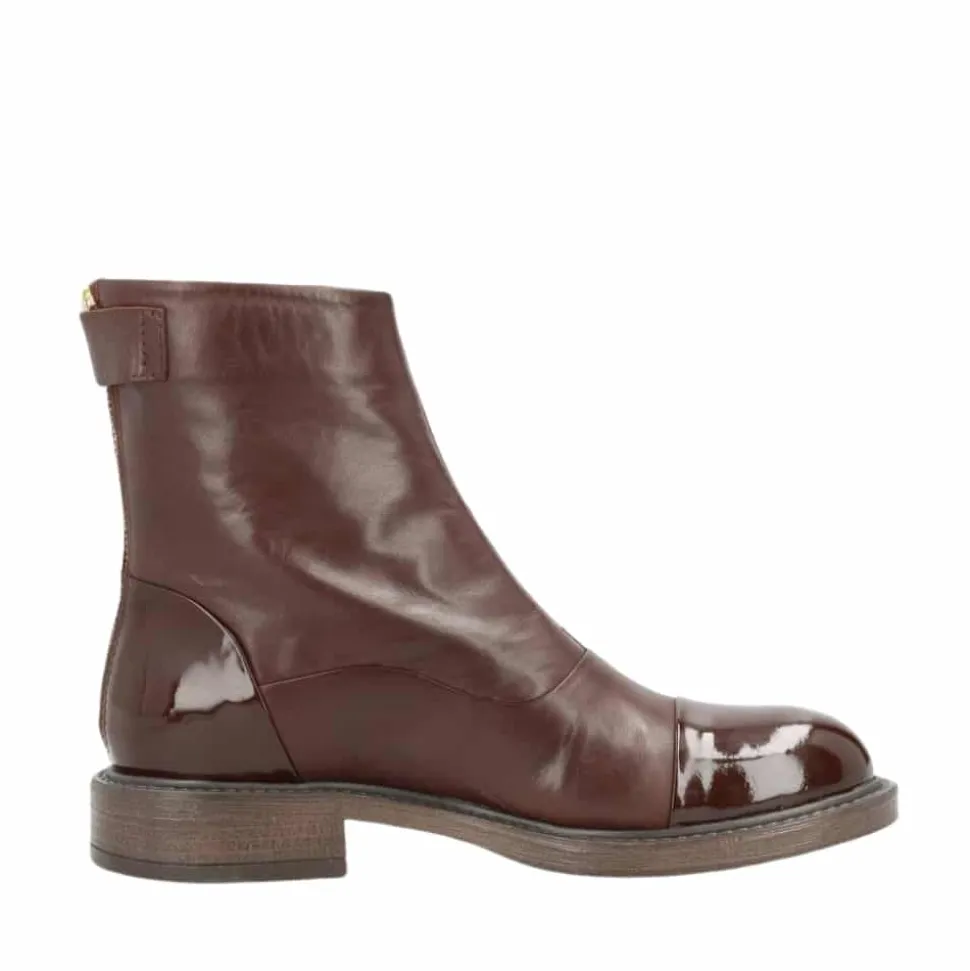 Shoedesign Copenhagen Dahlia P damestøvle i brun. Denne støvle er skabt af førsteklasses skind, som både føles smidigt og garanterer en enestående holdbarhed. Med en elegant lak-snude og lak-hæl tilfører støvlen et sofistikeret touch, der løfter hele designet. Her får du en perfekt kombination af stil, komfort og kvalitet, der virkelig gør indtryk. Den behagelige hæl på 3 cm giver lige det ekstra løft, du har brug for. Med en praktisk lynlås og en stilfuld knap bagpå er støvlen nem at tage af og på, så du hurtigt kan komme videre med stil.