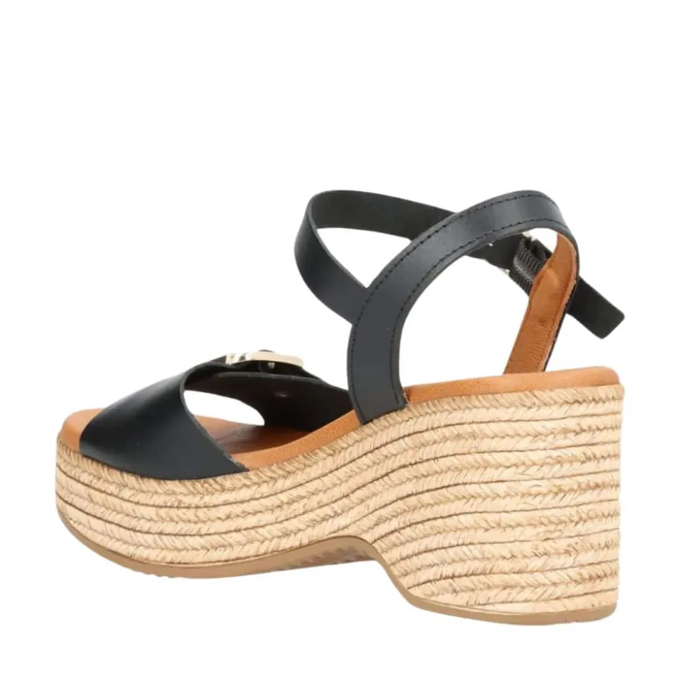 Shoedesign Copenhagen Lourdes sandal til dame i sort. Moderne sandal i en smuk sort farve, med et smukt design. Sandalen har nemlig en plateausål med et twist af en kilehæl, der pyntes af flotte fletdetaljer på siden og måler ca 7,5 cm. Den tykke sål sikrer en god komfort, da foden får støtte og du er derfor sikret optimal komfort dagen lang. Sandalen har desuden en bred rem ved forfoden, som pyntes af en justerbar guldspænde. Med guldspænde ved forfoden samt en justerbar spænde ved anklen, kan du nemt tilpasse sandalen til dine behov.