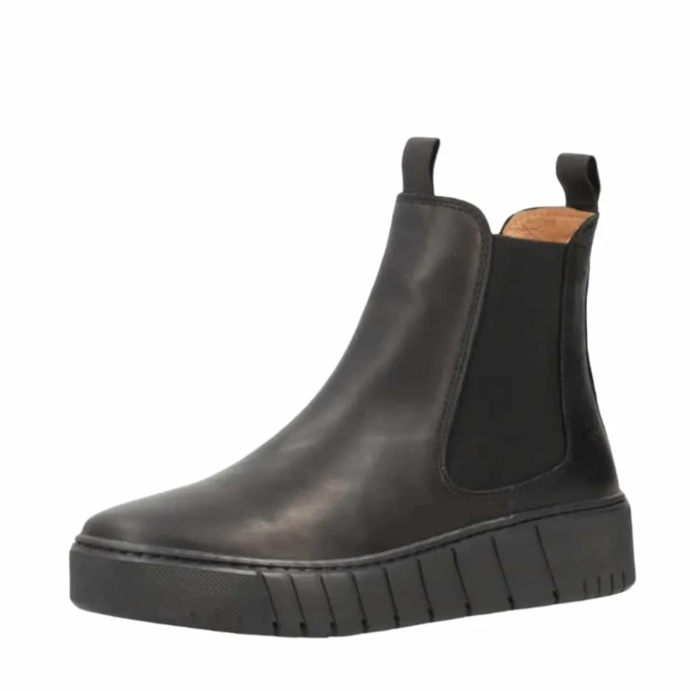 Shoedesign Copenhagen Mooved BLK støvle til dame i sort. Elegant sort chelseastøvle i glatskind, der kombinerer klassisk design med komfort. De elastiske sider gør det nemt og hurtigt at tage støvlen af og på, mens den bløde skindsål indvendigt giver behagelig støtte hele dagen. Med en kilehæl på ca. 4 cm får du et feminint løft, og den sorte gummisål med mønster giver både støtte og øget skridsikkerhed.
