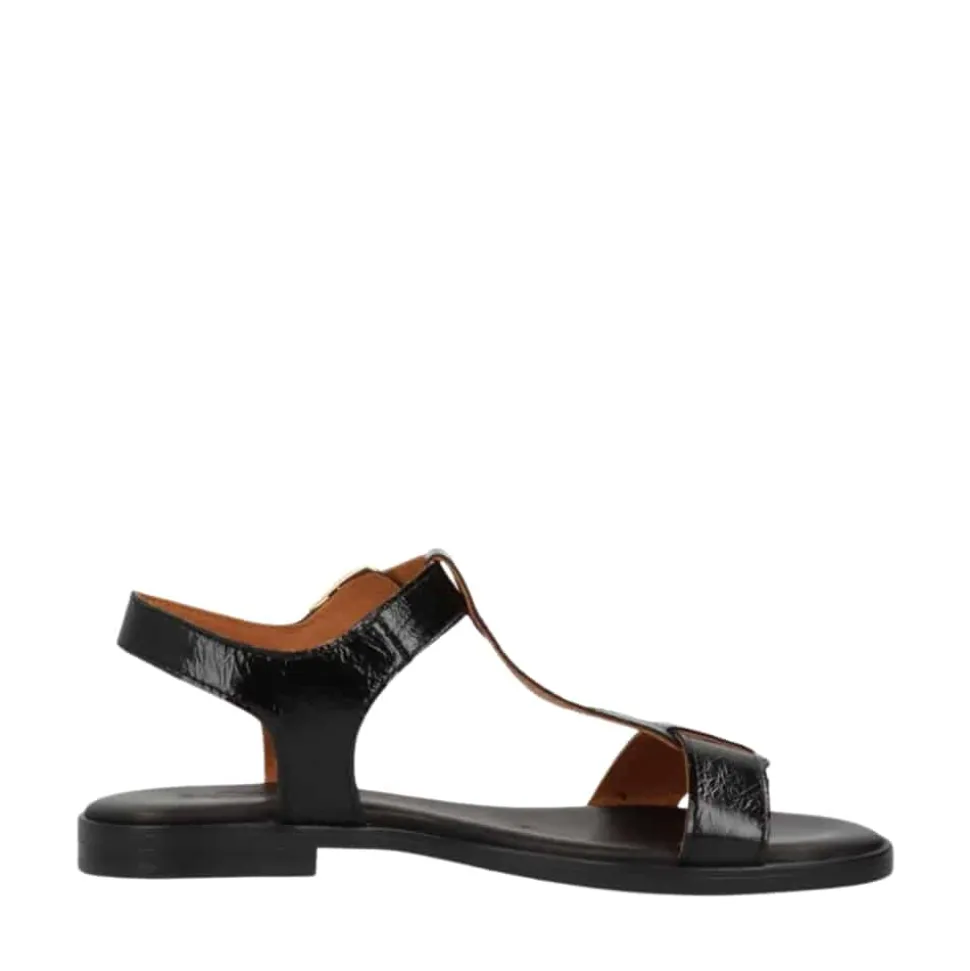 Shoedesign Copenhagen Nora P sandal til dame i sort lak. Elegant sort sandal med en skinnende lakoverdel og fine detaljer, der tilfører et stilfuldt udtryk. Sandalen er fremstillet i 100% skind og har en smuk rem over forfoden, der elegant går op til ankelremmen. Den gyldne spænde er justerbar, hvilket sikrer en perfekt pasform og gør sandalen nem at tage af og på. Indvendigt giver den bløde sål optimal komfort, mens den mønstrede ydersål sørger for stabilitet og skridsikkerhed.