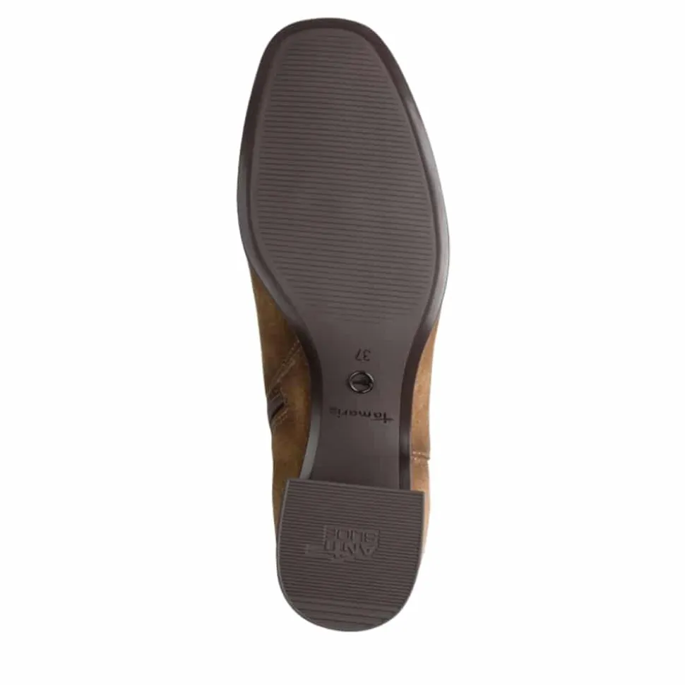 Tamaris lang støvle til dame i brun. Klassisk brun støvle med langt skaft i blødt ruskind, der kombinerer tidløs enkelthed med et moderne look. Lynlåsen på indersiden og elastikken giver en fleksibel pasform og gør modellen nem at tage af og på. Indvendigt sørger den bløde indersål med Touch It teknologi for, at skoen former sig efter foden og giver optimal komfort. Den cirka 6 cm høje blokhæl er udstyret med Anti-Slide og Anti-Shock, som giver øget skridsikkerhed og en behagelig gang.