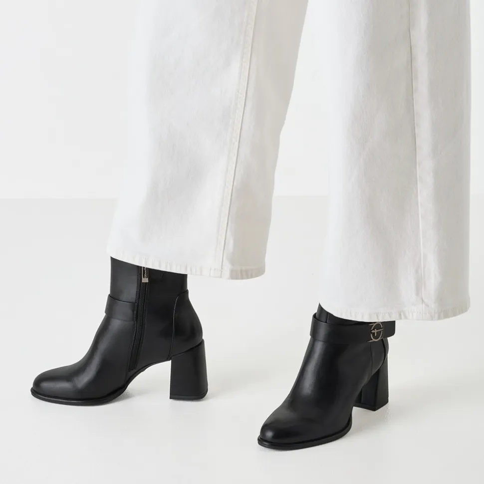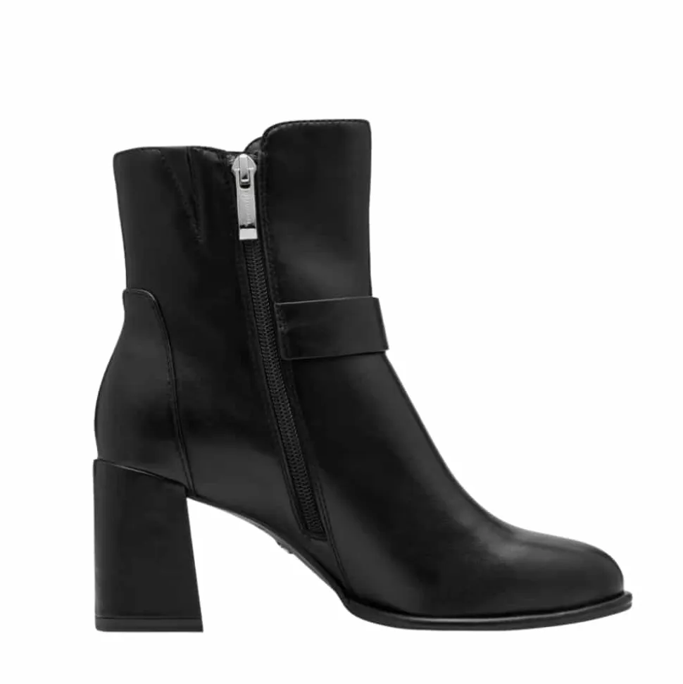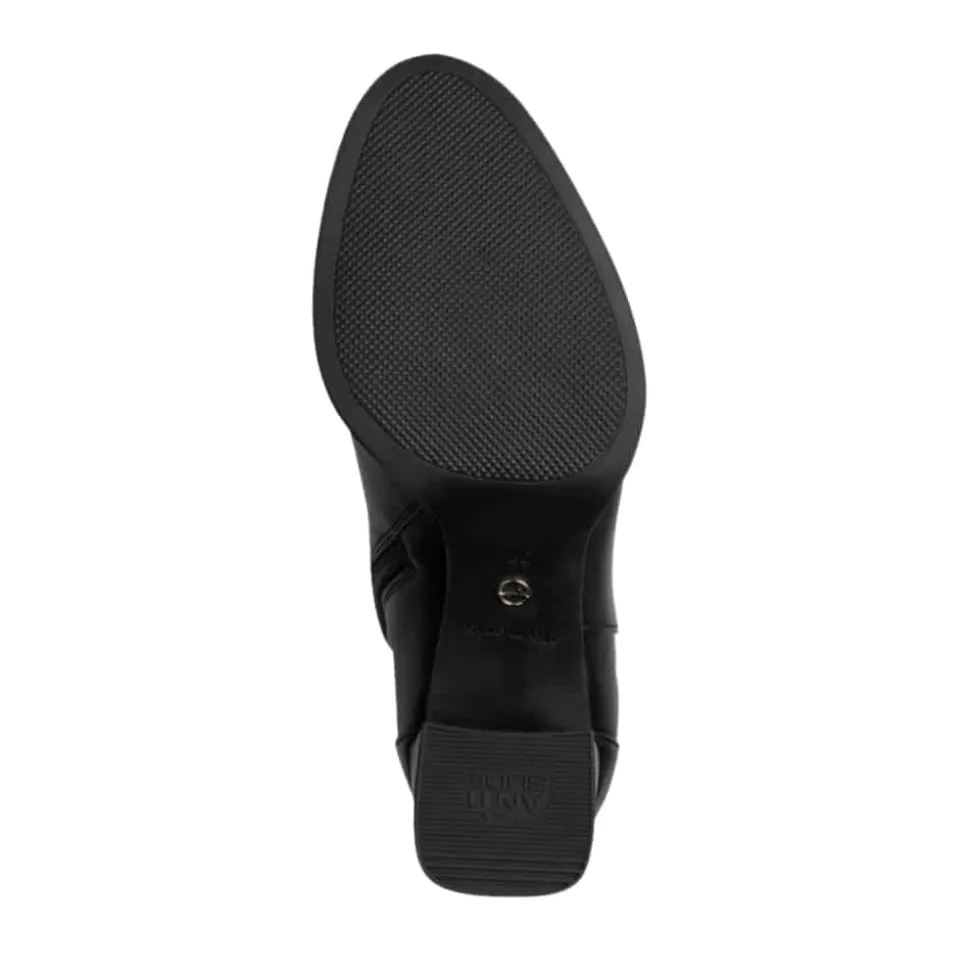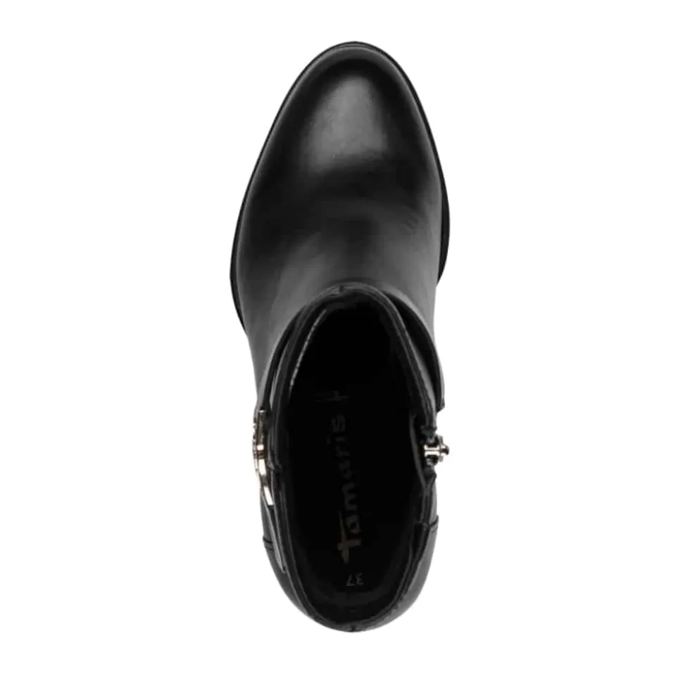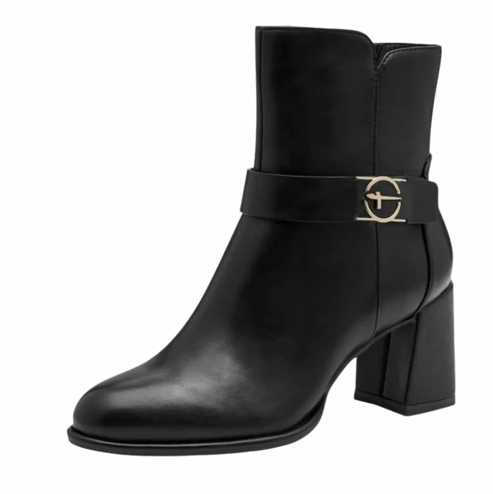 Tamaris støvle til dame i sort. Elegant støvle i sort med en gylden detalje på siden, der giver et moderne og stilfuldt udtryk. Støvlen har en funktionel lynlås på indersiden, så den er nem at tage af og på. Indvendigt er der en blød indersål med Touch It teknologi, som tilpasser sig fodens form og giver en god pasform. Den høje blokhæl på cirka 7,5 cm tilfører et elegant løft, mens ydersålen med Anti-Slide og Anti-Shock giver øget komfort og skridsikkerhed.