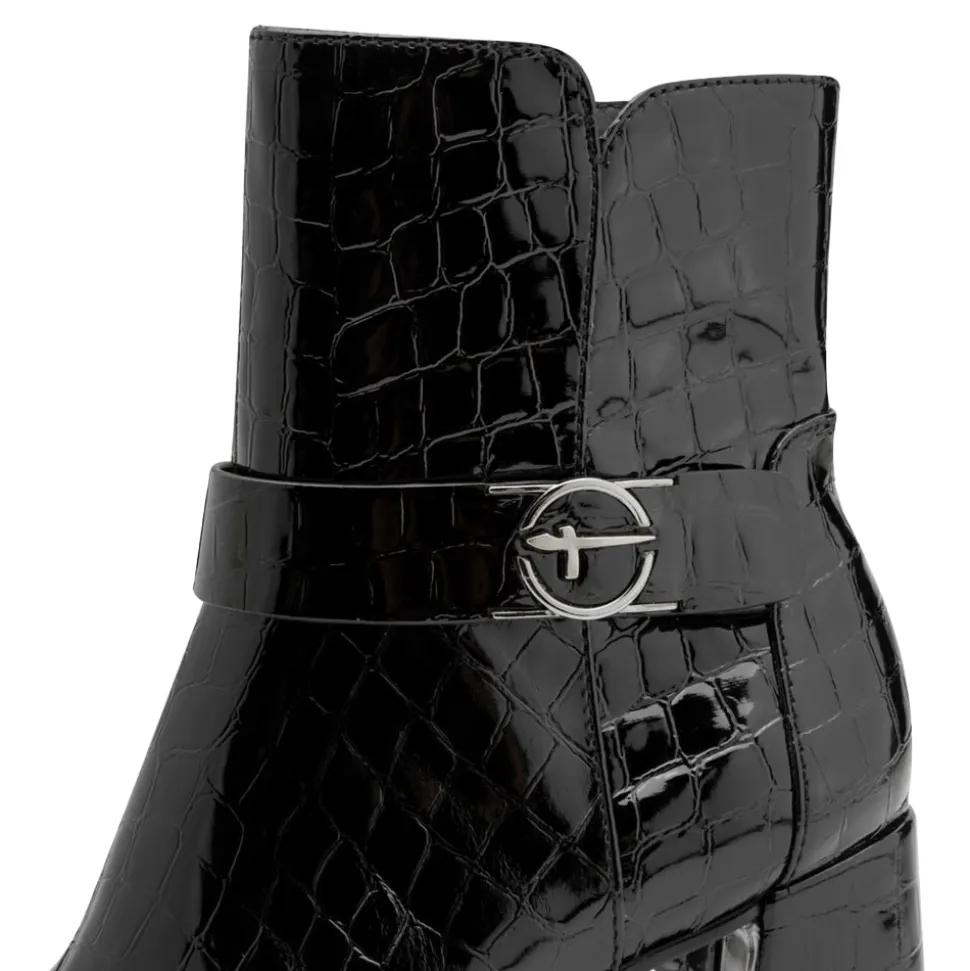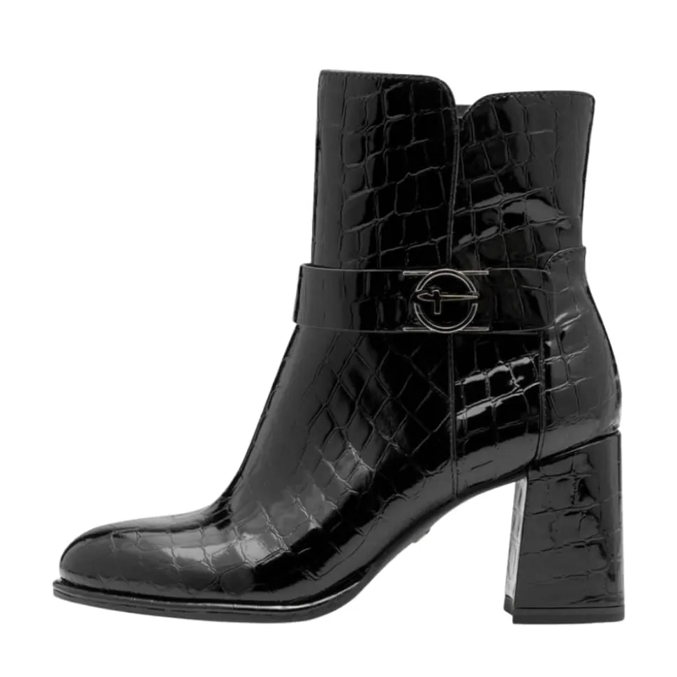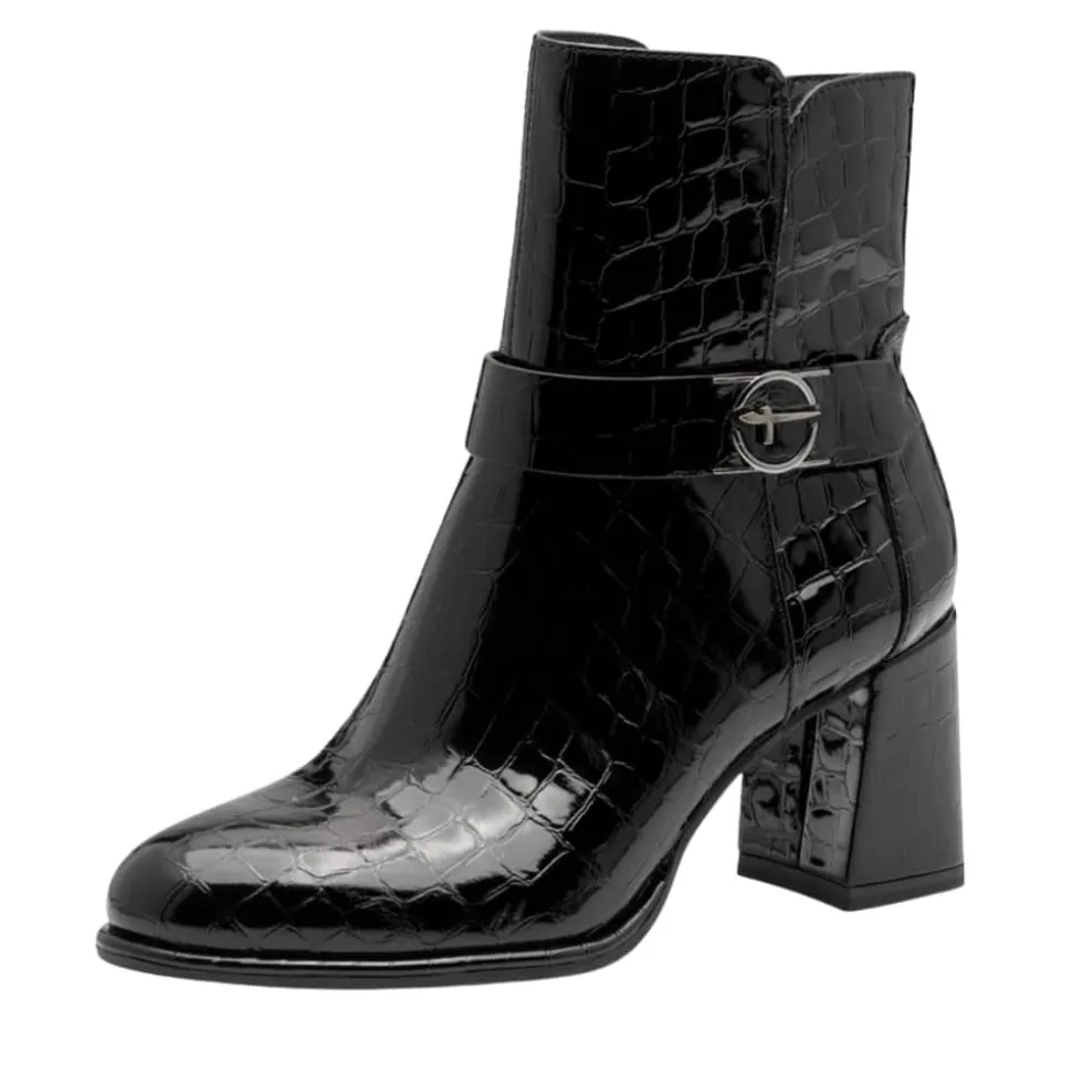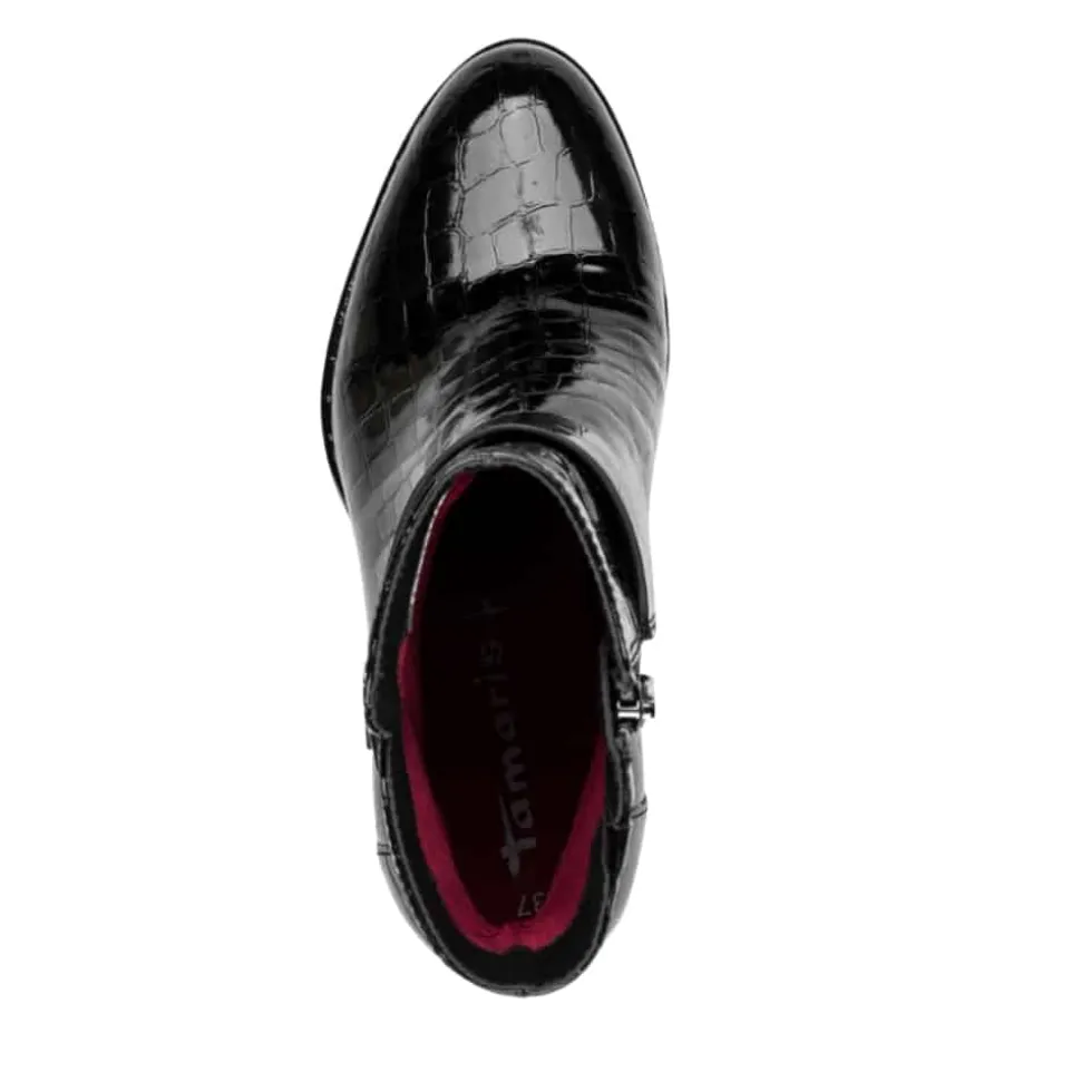 Tamaris støvle til dame i sort lak. Elegant støvle i sort med krokodillemønster og lakoverdel, som giver et moderne og stilrent look. Støvlen har flotte detaljer og en funktionel lynlås på indersiden, der gør den nem at tage af og på. Indvendigt finder du en blød indersål med Touch It teknologi, som former sig efter foden og sikrer en behagelig pasform. Den høje blokhæl på cirka 7,5 cm løfter looket elegant. Ydersålen har både Anti-Slide og Anti-Shock for øget komfort og skridsikkerhed.