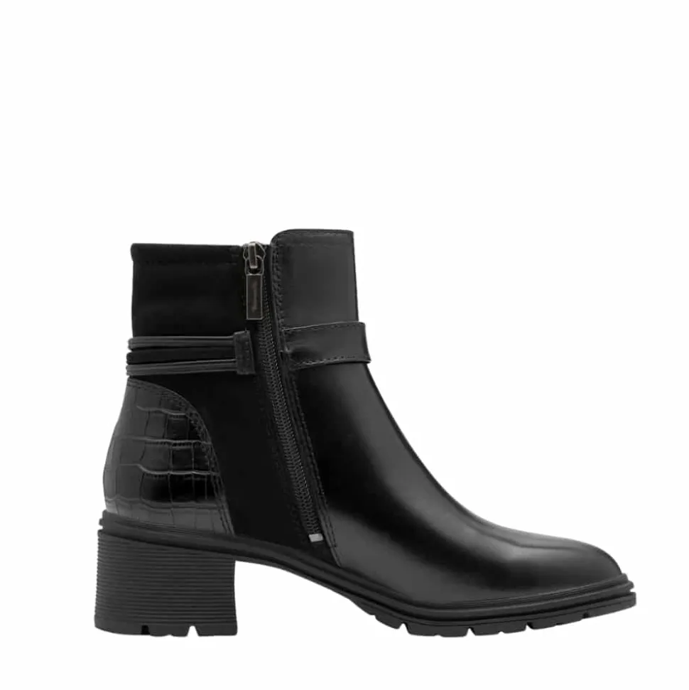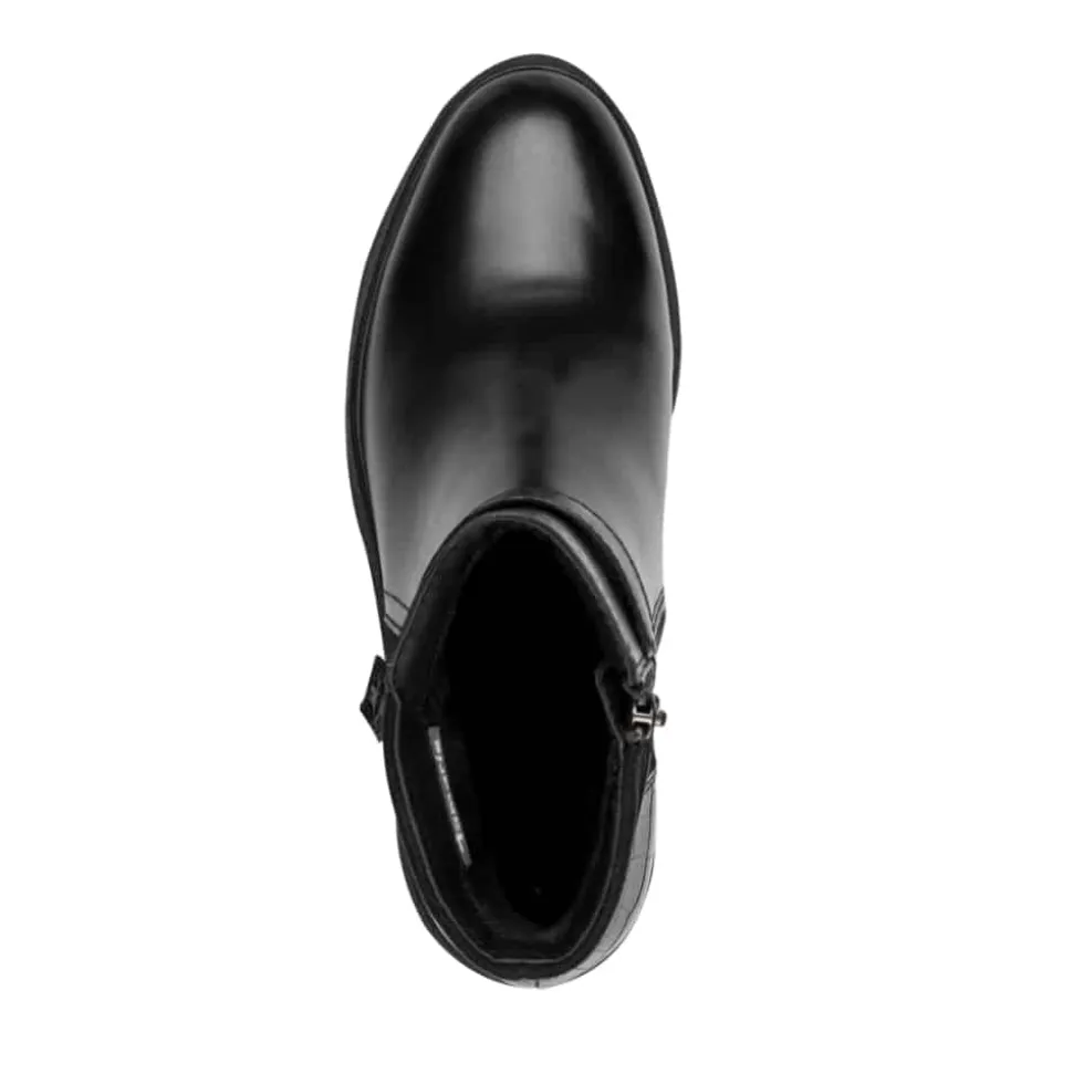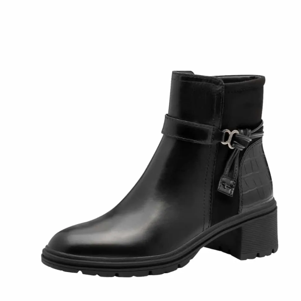 Tamaris støvle til dame i sort. Flot og elegant støvle i skind med en smuk detalje, der fuldender designet. Den funktionelle lynlås gør det nemt at tage støvlen af og på. Indvendigt finder du en let foring og en blød Touch-it sål, som former sig efter foden og giver en behagelig pasform. Støvlen har en blokhæl på 6 cm der tilfører et elegant løft, mens den mønstrede ydersål giver øget skridsikkerhed.