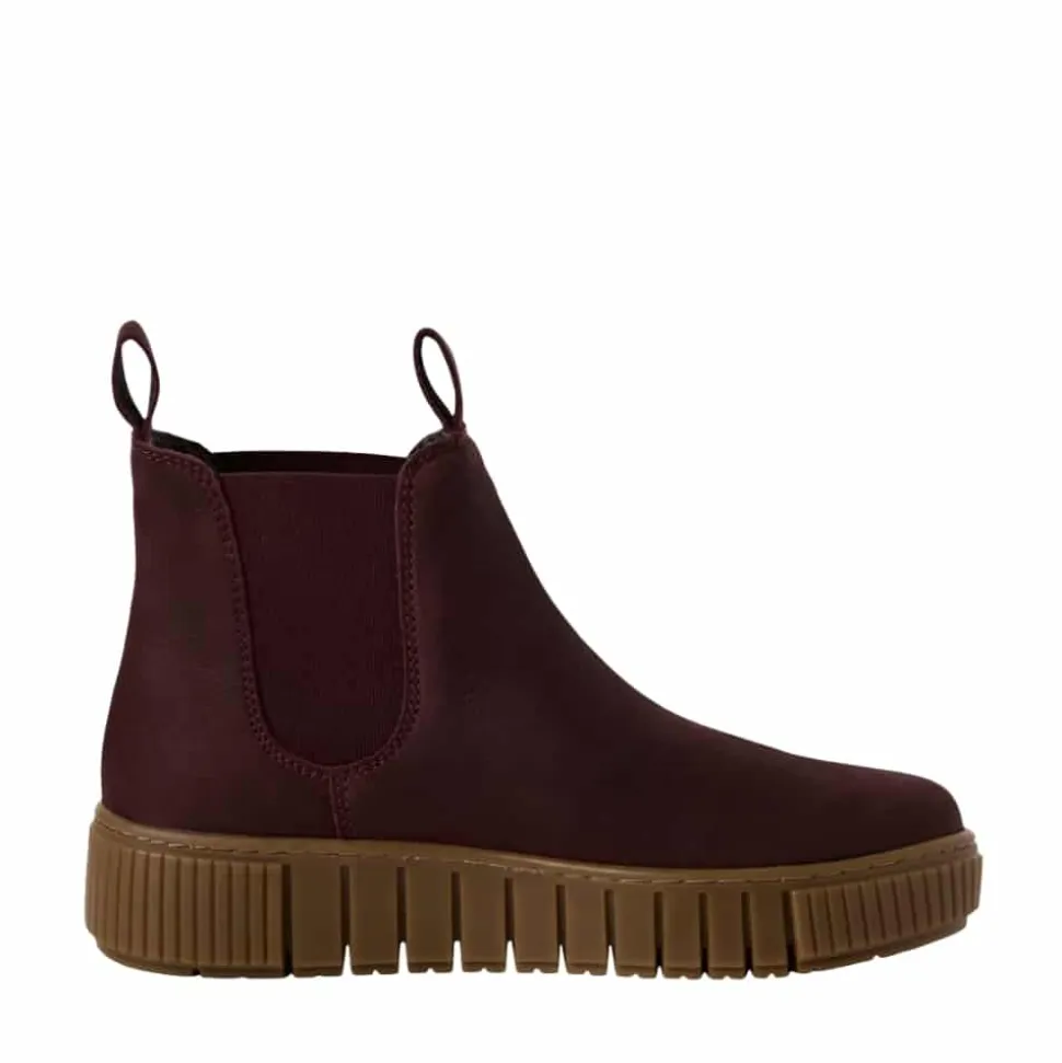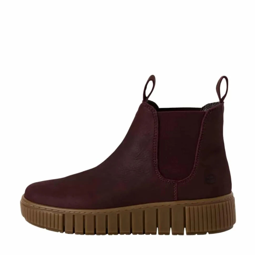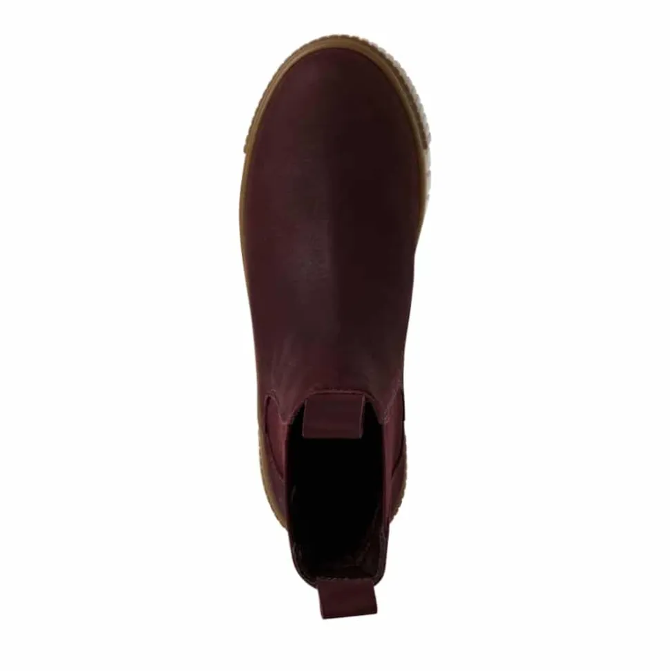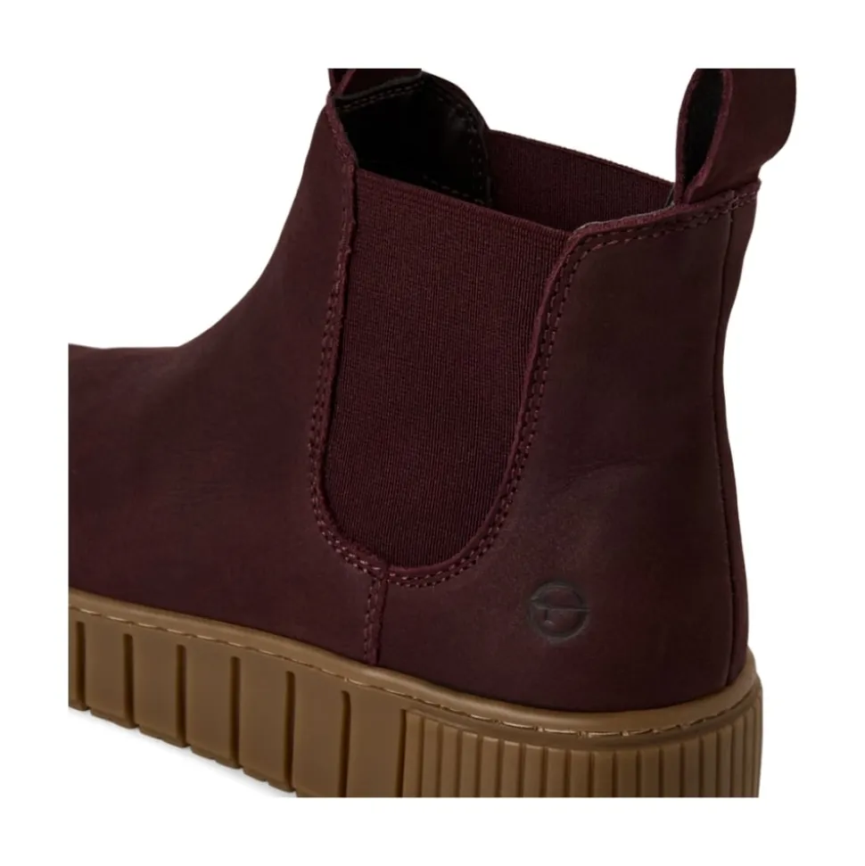 Tamaris støvle til dame i bordeaux. Disse støvler i bordeaux kombinerer stil og funktion i én løsning. Skindoverdelen giver et klassisk udtryk, mens elastikken på begge sider gør det let at tage støvlen af og på. Indvendigt møder du en let foring og en blød sål, som kan tages ud, hvis du har brug for det. Ydersålen har en højde på 4 cm, der giver et elegant finish, og mønsteret bidrager til både øget stødabsorbering og skridsikkerhed i dine skridt.