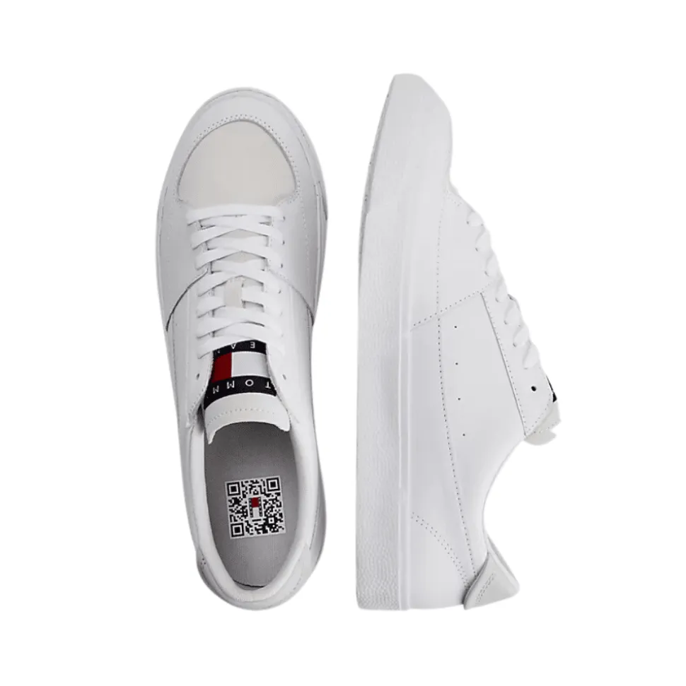 Tommy Hilfiger sneakers i hvid til herre EMOEMO1106YBR. Lækker sneakers i skind fra Tommy Jeans. Modellen har et klassisk hvidt og stilrent design med beige detaljer. Modellen har snøre foran, så du kan justere den efter din fod. Dejlig fleksibel og let sneakers.