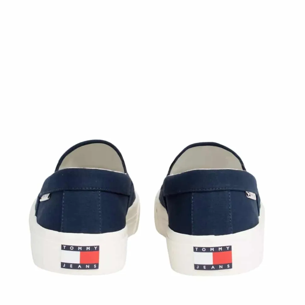 Tommy Jeans sko i mørkeblå til herre. Slip in sko fra Tommy Jeans i en elegant mørkeblå farve. Skoens ydersål er udfærdiget i naturgummi, der sikrer solidt fodfæste. Modellen er let at glide i, takket være den smarte designløsning med elastik i siderne, hvilket gør dem ideelle til travle dage. For optimal komfort er modellen udstyret med udtagelige såler, der giver dig mulighed for at tilpasse skoene efter dine egne præferencer eller erstatte sålerne, når det er nødvendigt.