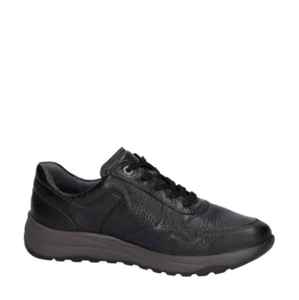 Waldläufer sneakers til dame i sort. Disse sneakers i sort skind kombinerer praktiske detaljer med høj komfort. Modellen er udstyret med snørebånd og to lynlåse, så du nemt kan få dem af og på. Indersålen i blødt skind kan tages ud og giver god støtte dagen igennem. Med ekstra bredde (M) får du fleksibilitet til foden, og ydersålen med mønster giver øget skridsikkerhed.