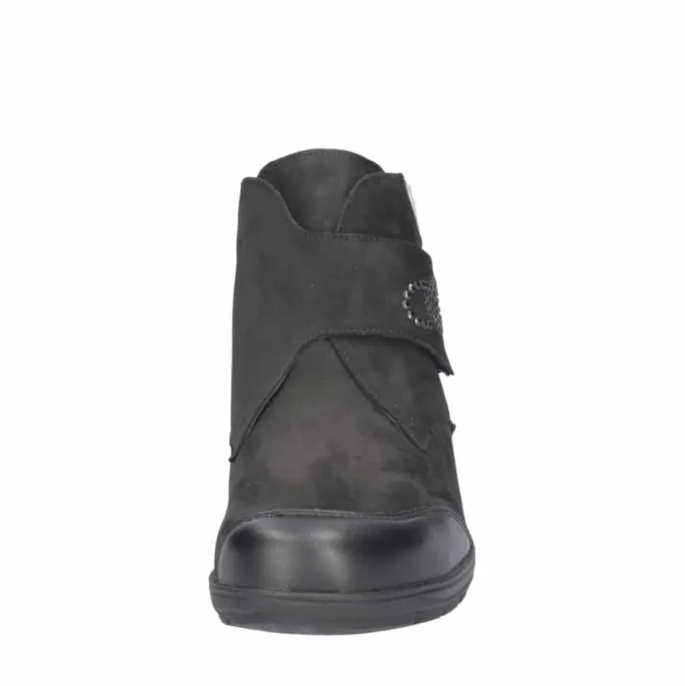 Waldläufer støvle til dame i sort. En stilfuld støvle i sort med elegante detaljer og en overdel i 100% skind, der giver et moderne og feminint look. Støvlen er udstyret med en praktisk velcrorem, som gør det nemt at justere pasformen og tage støvlen af samt på. Indvendigt finder du en blød, udtagelig indersål med ekstra bredde M samt en varm foring, der holder fødderne lune. Ydersålen er solid og mønstret for at give øget stabilitet og skridsikkerhed.