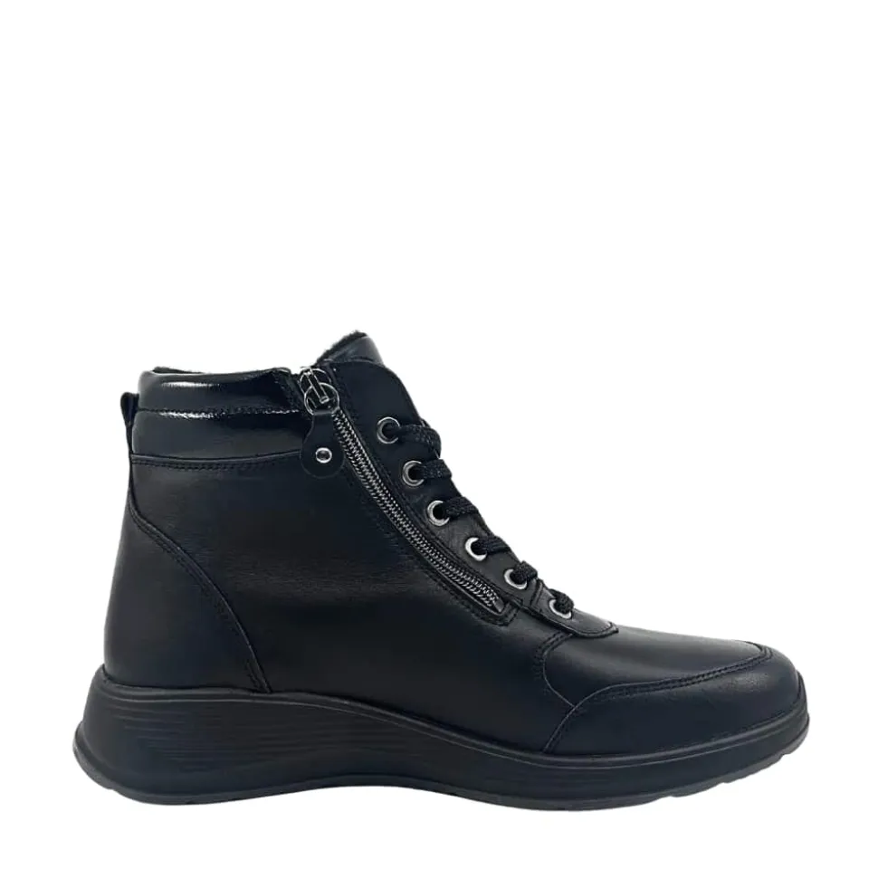 Waldläufer støvle til dame i sort. En stilfuld støvle i sort med elegante lakdetaljer, der giver et moderne og feminint udtryk. Overdelen er fremstillet i 100% skind og er udstyret med to lynlåse og snørebånd, som gør støvlen nem at få på. Indvendigt finder du en blød, udtagelig indersål med ekstra bredde K for optimal komfort samt en varm foring, der holder fødderne lune. Ydersålen er robust og har et mønster, som giver god stabilitet og skridsikkerhed.